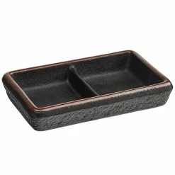 Acopa Heika 1 Oz. Black Matte Textured Rectangular 2-Compartment Stoneware Sauce Dish – 12/Case